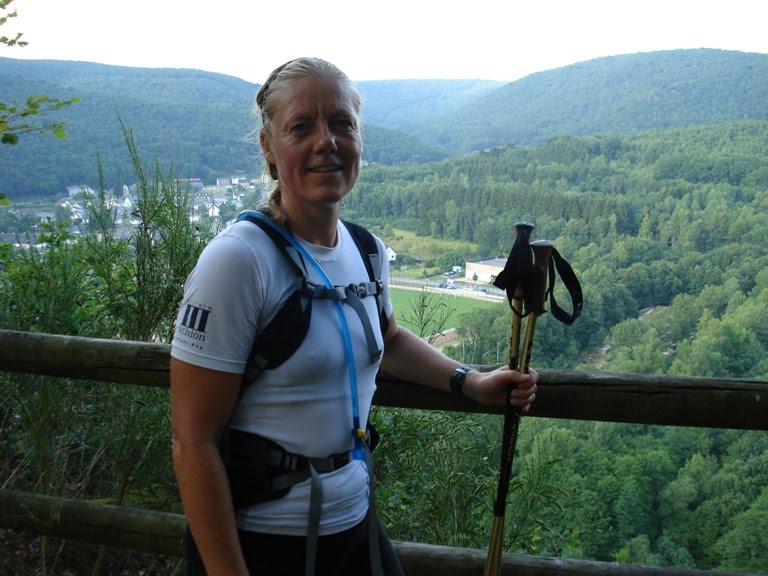 Nog een laatste foto op de laatste berg voor de finish – die daar beneden (ongeveer naast mijn stokken) ligt. Alsof ik de meet al rook – als een speer naar beneden over kronkelpaadjes, mezelf behendig met mijn stokken mijn balans houdend, weg oversteken, door rivier de Semois waden en dan met natte schoenen heel heroisch de laatste 400m naar de finishstreep sprinten. Net voor de streep werd er nog keihard gejuicht+geklapt door alle bierdrinkende en BBQworstetende finishers+supporters (opgejut door M). Eindtijd: 15uur30min; blaren minimaal, spierpijn maximaal, glimlach van oor tot oor!