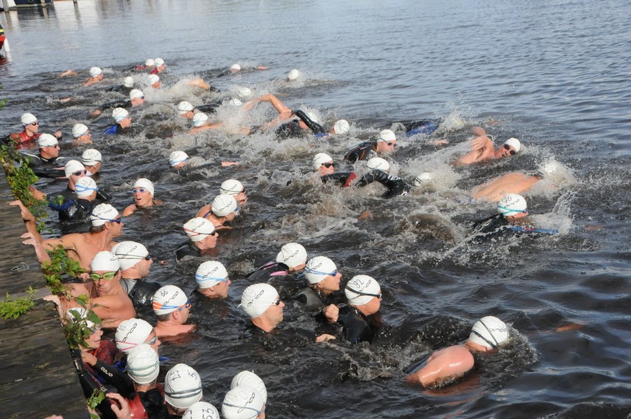Op zondag 29 augustus mocht het dus gaan gebeuren in het Paterswoldsemeer. Bij Restaurant De Twee Provincien melden we ons. Hier krijgen we onze badmuts met nummer en finisher’s t-shirt. In het restaurant trekken we ons wetsuit aan, zetten de badmuts op en leggen spullen in een auto die naar de finish rijdt. We zwemmen namelijk van dit restaurant via een grote boog over het meer naar Restaurant Kaap Hoorn.