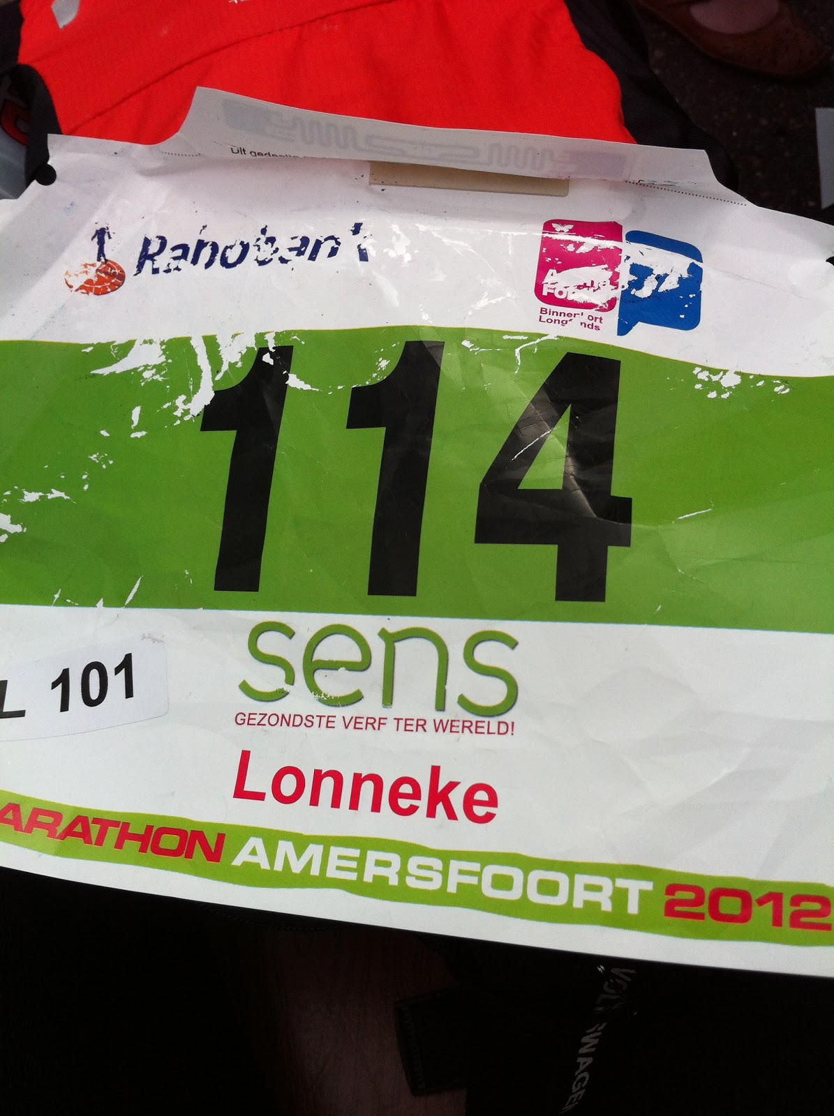 Mijn trainingen waren deze week een beetje in de soep gelopen door regen en andere onzin. Mijn zondagplannen stonden nog niet vast – waarom dan niet een marathon lopen.. Via twitter (tnks!) een startnummer geregeld – Lonneke kon helaas niet lopen vanwege blessure. Op zaterdag dag werken – ’s avonds voeding geregeld (soeper ananasgel van Marcel!) – zondagochtend op fiets naar Amersfoort. Goed voorbereid? Mwah, het had beter gekund..ik had de afgelopen weken kunnen trainen, massages nemen, meer pastas eten, etc. Maar dat had ik niet gedaan, ik had het spontaan bedacht dus zou ik ook spontaan hard gaan lopen; de eindtijd.. geen idee, iets van 3:30 leek me geweldig snel.