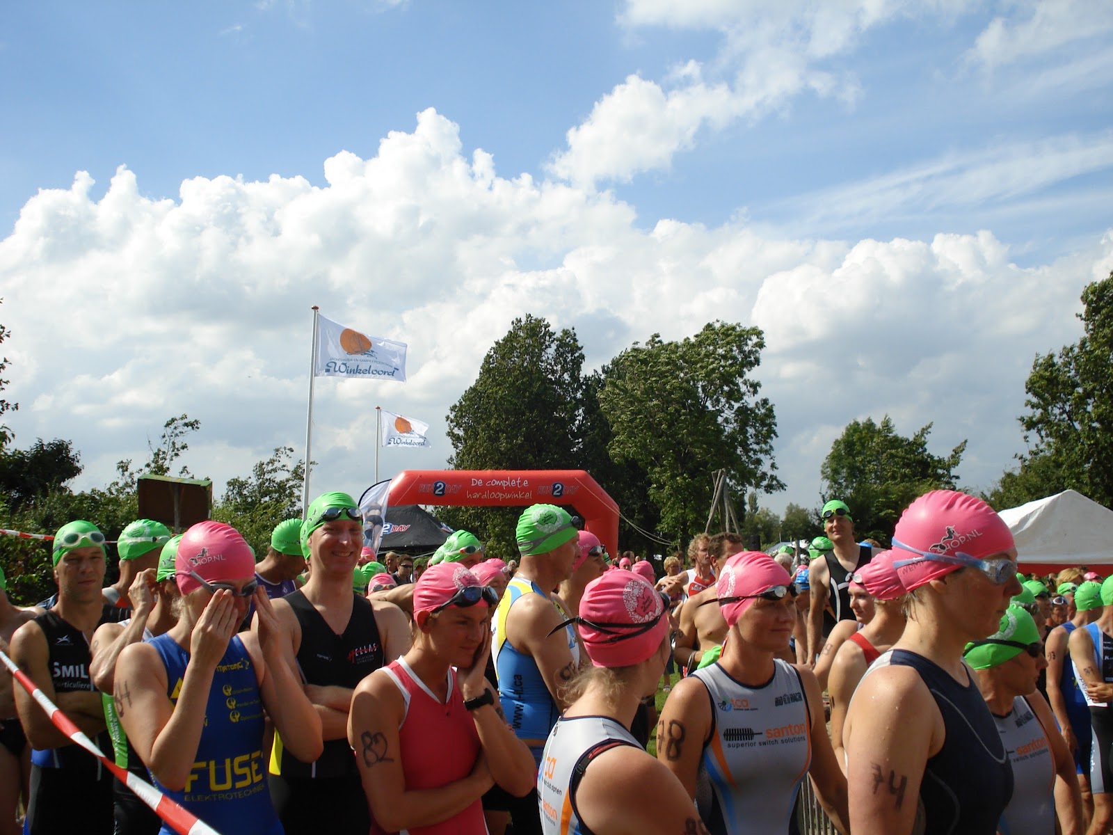 Zaterdagmiddag om 16:00uur mochten de eersten van start. Er werden elke 10 seconden 2 zwemlopers weggeschoten. Op die manier zou het niet te druk zijn bij de trappetjes van de eilanden. Ik had een hoog startnummer dus ik kon het allemaal rustig bekijken. Super ontspannen sfeertje op het wedstrijdterrein en veel bekenden onder de starters.